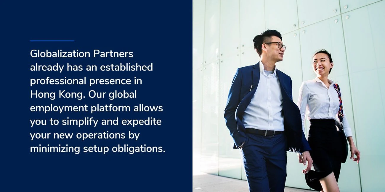 Establishing a subsidiary is a traditional option. However, sometimes your company needs to minimize the challenges of international growth, start hiring employees right away, and ensure complete compliance with Hong Kong’s regulations. In that case, working with Globalization Partners’ global employment platform is highly beneficial.