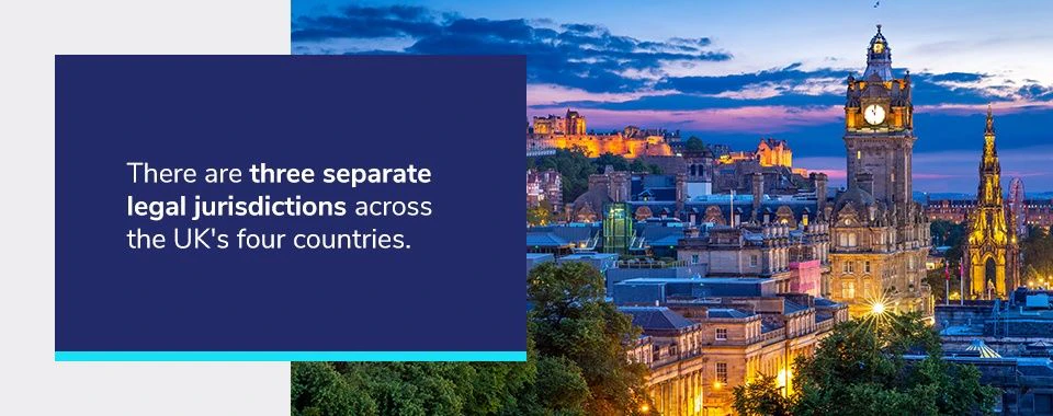 There are three separate legal jurisdictions across the UK’s four countries. Northern Ireland and Scotland each have their own legal jurisdiction, while England and Wales operate under the same one. Scotland’s system is based on a combination of civil and common law, while the other three countries use common law guidance. Each jurisdiction has a system that may complicate hiring practices or ongoing business laws, depending on the location and size of your company.