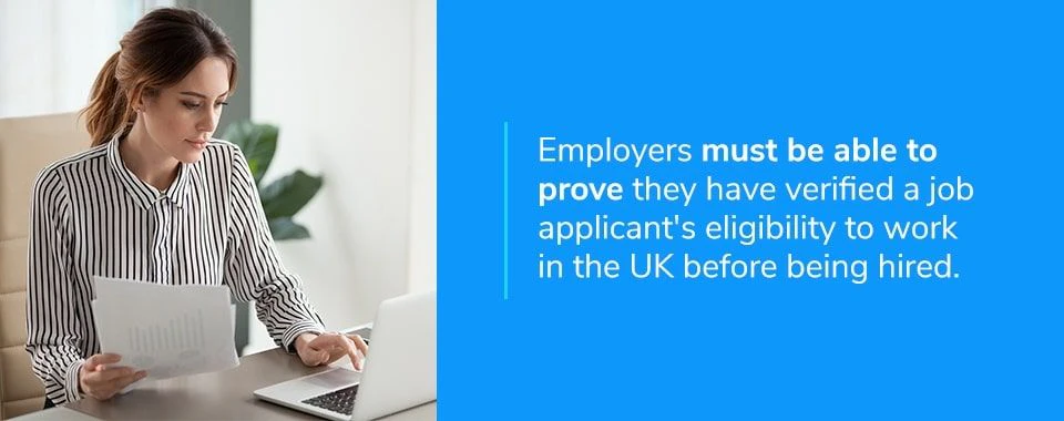 All employers must be able to prove they have verified a job applicant’s eligibility to work in the UK before being hired, or they risk a 20,000 British pound fine. When checking identification, make a legible copy and confirm all dates, photos, names, and other relevant information match your records. Conduct ongoing verification as needed.