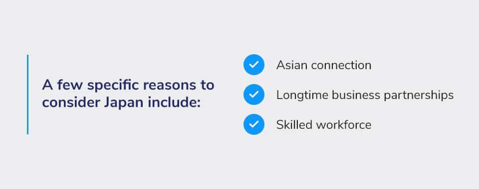 Japan is another location India-based companies should have on their radar. The Ministry of External Affairs of India points out that the two countries have never been adversaries and share ties across spiritual, cultural, and civilizational lines. A few specific reasons to consider Japan include: