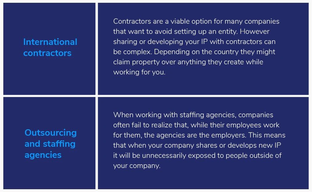 If you want to hire internationally without setting up an entity, your company may decide to work with international contractors or staffing agencies but be prepared for intellectual property protection challenges.